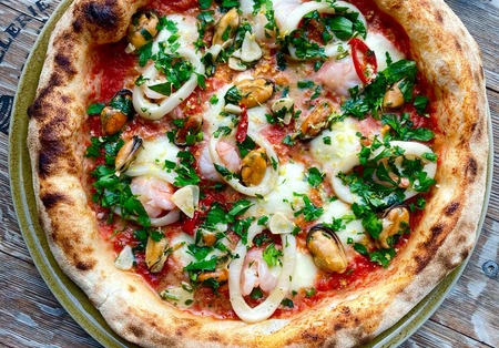 sos pomidorowy /mozzarella fior di latte / krewetki tygrysie / mule / kalmary / czosnek / chili / świeża pietruszka / skórka cytrynowa